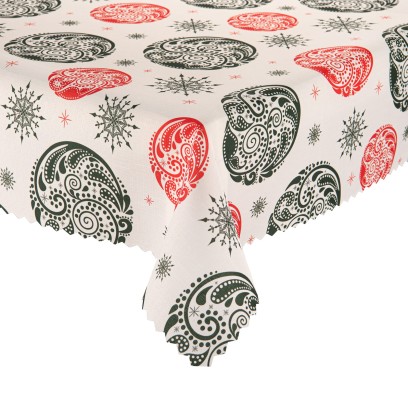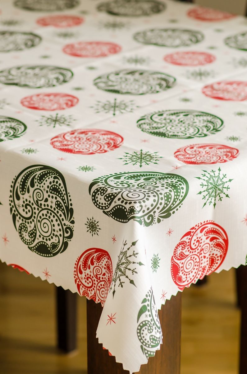 Zadbaj o wyjątkowy klimat świąt i zachwyć gości świątecznym stołem za sprawą obrusu Bożonarodzeniowy. Jego powierzchnia ozdobiona jest graficznymi ornamentami w odcieniach zieleni i czerwieni oraz delikatnymi śnieżynkami, co na śnieżnobiałym tle daje efekt elegancji i nowoczesności. Obrus wykonano z wysokiej jakości, plamoodpornego poliestru o gramaturze 140–160 g/m², który dzięki powłoce teflonowej chroni stół przed zabrudzeniami – wszelkie płyny i sosy zatrzymują się na powierzchni tkaniny i można je łatwo usunąć za pomocą wilgotnej ściereczki.