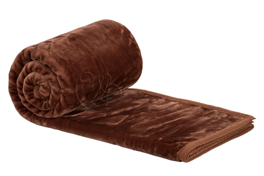 Ozdobny koc Elway w kolorze brązowym. Koc jednokolorowy gładki w wykonaniu dwustronnym. Ozdobna strona prezentuje kolor brązowy z delikatnym połyskiem a druga jest odzwierciedleniem tego samego koloru bez połysku i nieco jaśniejszej tonacji. Koc w całości obszyty lamówką w kolorze koca.