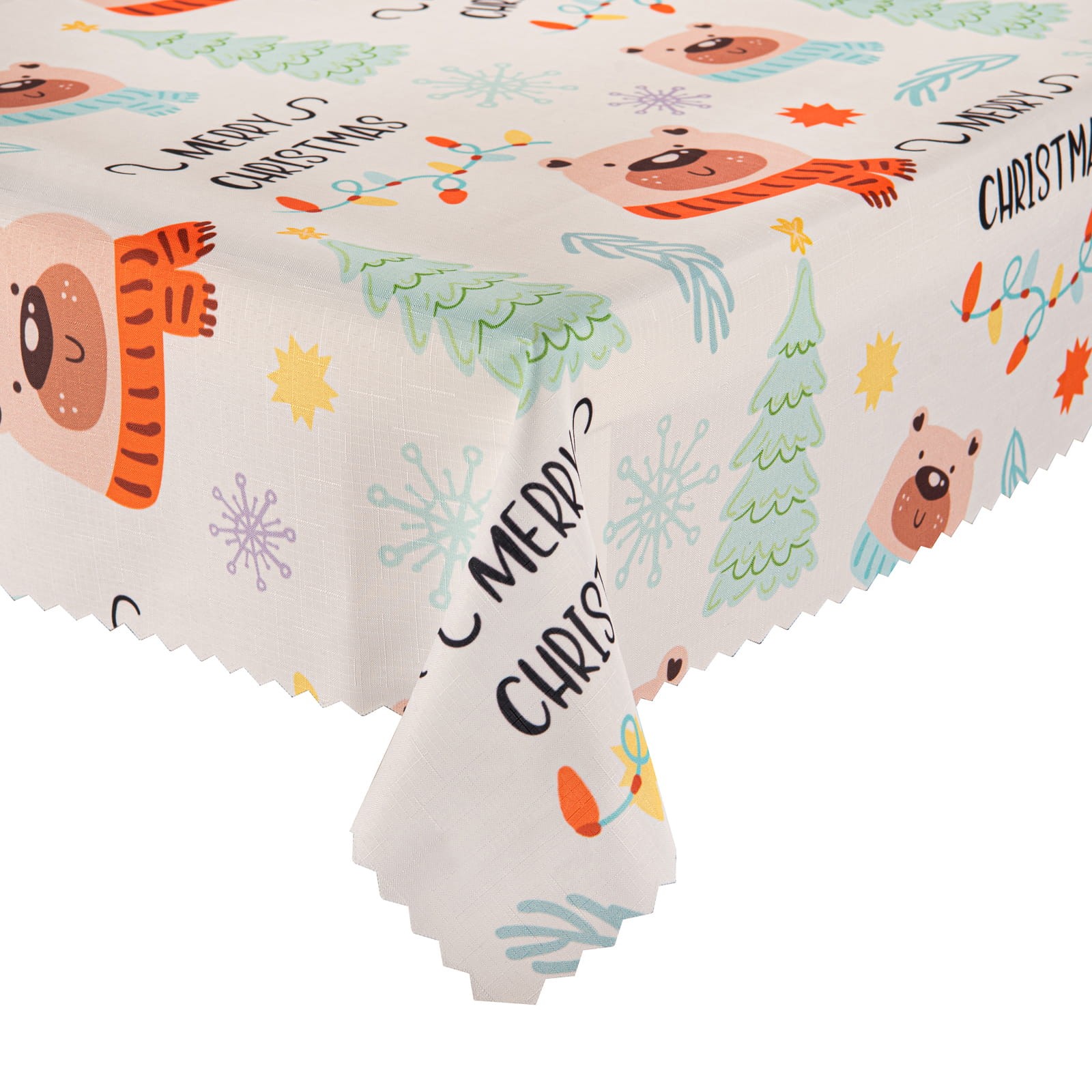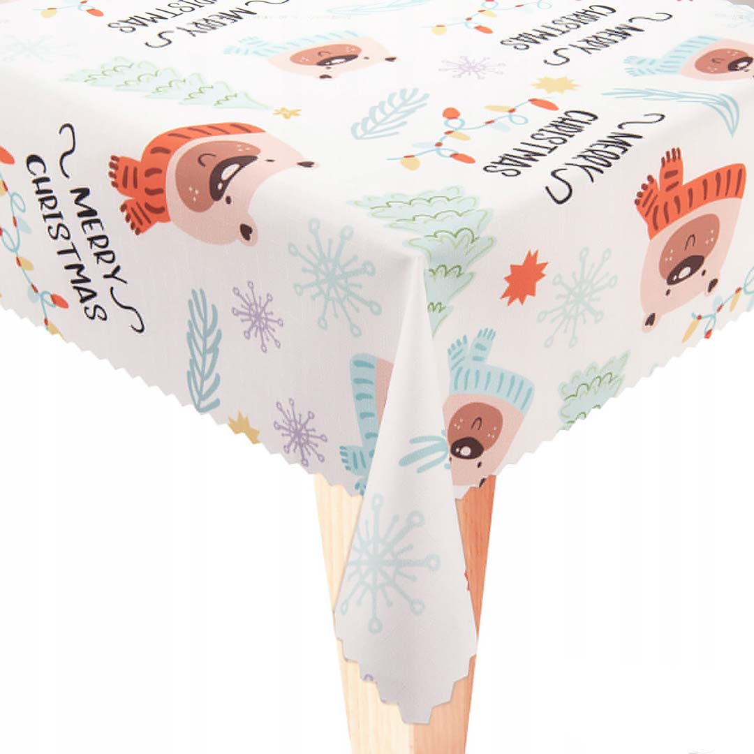 Ten uroczy obrus świąteczny ozdobiony wesołymi grafikami misiów w kolorowych szalikach, choinkami, śnieżynkami i napisem "Merry Christmas" to świetny wybór na rodzinne święta czy do pokoju dziecięcego. Pastelowa kolorystyka oraz wesołe motywy tworzą wyjątkowo pogodną atmosferę, a praktyczna, plamoodporna tkanina ułatwia codzienną pielęgnację i pozwala cieszyć się czystością nawet podczas dziecięcych zabaw.
