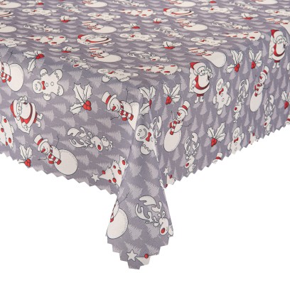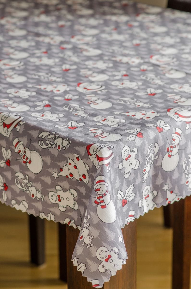 Wesoły obrus świąteczny z motywami bałwanków, pierniczków, reniferów, św. Mikołaja, ostrokrzewu, gwiazdek i choinek na klasycznym, szarym tle doskonale wkomponowuje się w nowoczesne i tradycyjne wnętrza. Wykonany z wysokiej jakości, plamoodpornego poliestru o gramaturze 140–160 g/m², zabezpieczony nowoczesną powłoką teflonową, która skutecznie chroni materiał przed wchłanianiem płynów oraz powstawaniem zabrudzeń. Obrus jest trwały, odporny na wielokrotne pranie i zachowuje świeżość kolorów na długo. Ząbkowany, dekoracyjny brzeg nadaje całości lekkości i podkreśla świąteczny charakter produktu. Świetnie sprawdzi się na domowym stole, jak również w restauracji czy kawiarni.