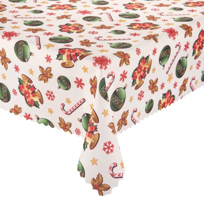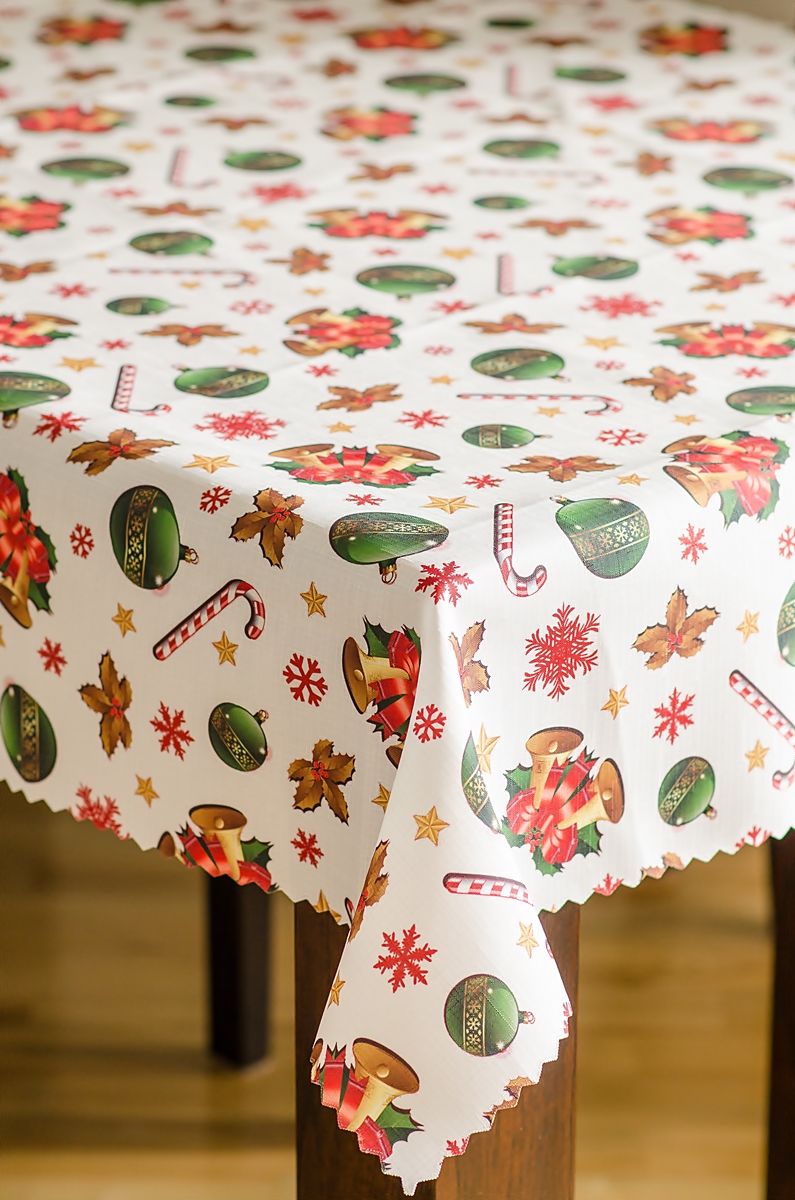 Barwny, radosny obrus z motywami zielonych bombek, złotych dzwonków, lasek cukrowych, ostrokrzewu, śnieżynek i gwiazdek na białym tle doda blasku każdej bożonarodzeniowej aranżacji. Wykonany z wysokiej jakości poliestru o gramaturze 140–160 g/m², pokryty jest powłoką teflonową, która skutecznie zabezpiecza materiał przed przesiąkaniem płynów i powstawaniem trudnych do usunięcia plam. Obrus jest wyjątkowo łatwy w pielęgnacji, zachowuje wyraziste kolory i formę nawet po wielu praniach, a dekoracyjny ząbkowany brzeg dodaje mu odświętnej elegancji. To praktyczny wybór zarówno do domowego stołu, jak i do gastronomii – pięknie podkreśla nastrój świątecznych spotkań.