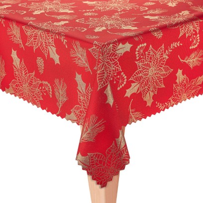 Elegancki, dwustronny obrus świąteczny w intensywnym czerwonym kolorze z efektownym, złotym wzorem gwiazdy betlejemskiej, gałązek świerku, ostrokrzewu i szyszek natychmiast wprowadza niepowtarzalny, bożonarodzeniowy klimat. Wykonany z wysokiej jakości poliestru pokrytego teflonową powłoką, zapewnia trwałość, plamoodporność i łatwość pielęgnacji. Obrus można używać z obu stron, dopasowując aranżację stołu do okazji i nastroju. Dekoracyjny, ząbkowany brzeg dodaje elegancji. Dostępny w wielu różnych rozmiarach i kształtach: prostokątny, kwadratowy oraz okrągły. To doskonały wybór zarówno do domu, jak i do restauracji czy hoteli.