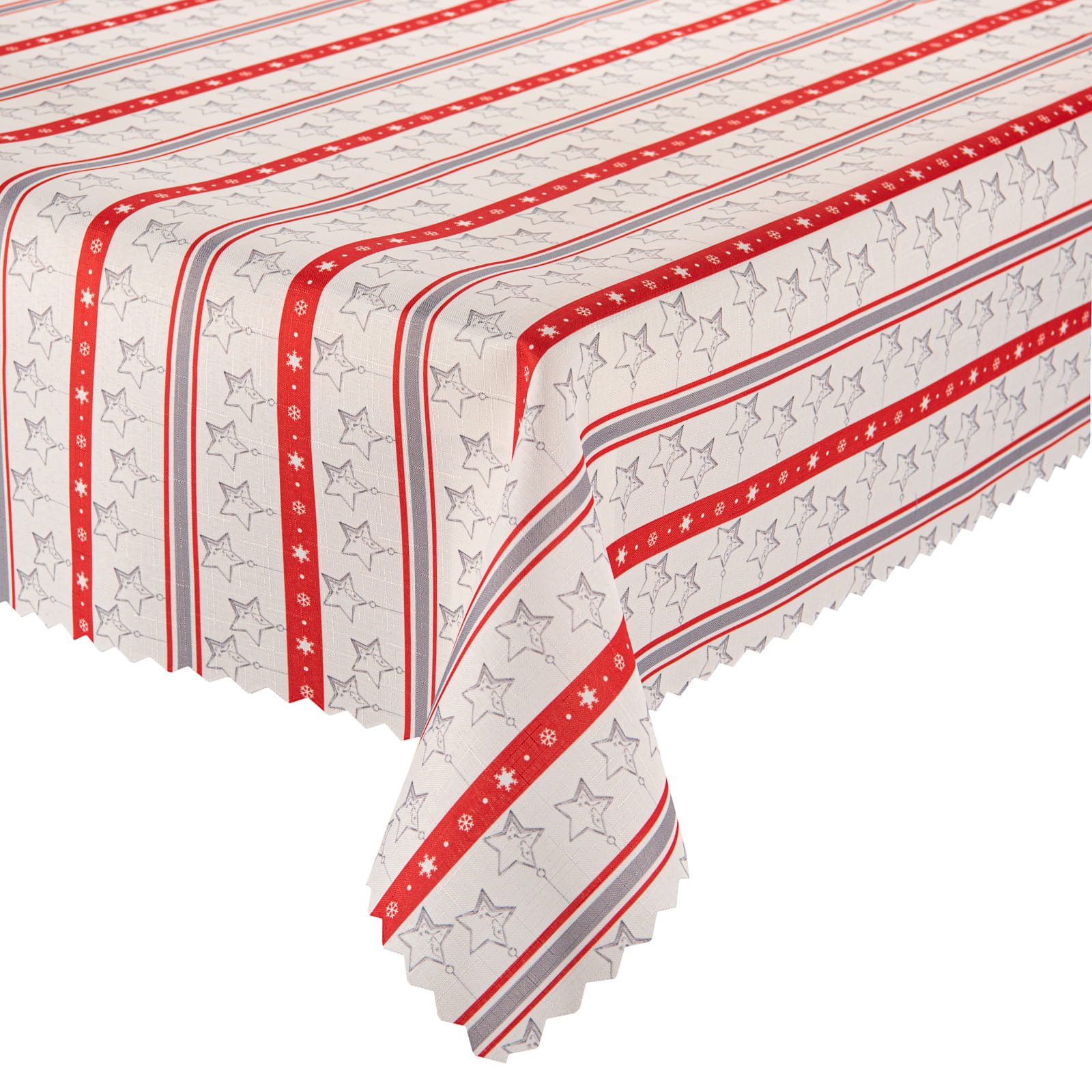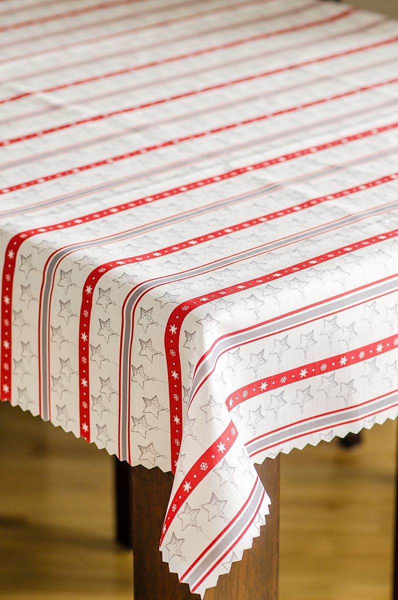 Elegancki, nowoczesny obrus świąteczny, który zachwyca zestawieniem czerwonych i szarych pasków oraz subtelnych gwiazdek na białym tle. Ten plamoodporny obrus wykonany jest z wysokiej jakości poliestru o gramaturze 140–160 g/m² – dzięki temu doskonale sprawdzi się zarówno w domu, jak i w restauracji czy kawiarni. Specjalna powłoka zapobiega wchłanianiu płynów, co znacząco ułatwia utrzymanie obrusu w czystości nawet podczas świątecznych spotkań i rodzinnych uroczystości. Materiał zachowuje swoje kolory oraz formę nawet po wielu praniach, a komfortowa tkanina jest łatwa do prasowania. Dekoracyjne, ząbkowane wykończenie brzegów podkreśla odświętny charakter i wyjątkowo prezentuje się na stole w każdym wnętrzu.
