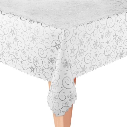 Elegancki, dwustronny obrus świąteczny w klasycznej bieli z efektownym, srebrnym wzorem gwiazdek, płatków śniegu i spiral wprowadzi wyjątkowy, zimowy klimat na każdym stole. Wykonany z wysokiej jakości poliestru z powłoką teflonową, jest plamoodporny, trwały i łatwy w pielęgnacji. Możliwość użytkowania z obu stron pozwala odmieniać aranżację – jedna strona dominuje kolorem białym ze srebrnym wzorem, druga to odwrotność kolorystyczna. Ozdobny ząbkowany brzeg dodaje nowoczesnego stylu. Obrus dostępny w wielu rozmiarach i kształtach: prostokątny, kwadratowy, okrągły. Idealny zarówno do domu, jak i do restauracji czy hoteli.