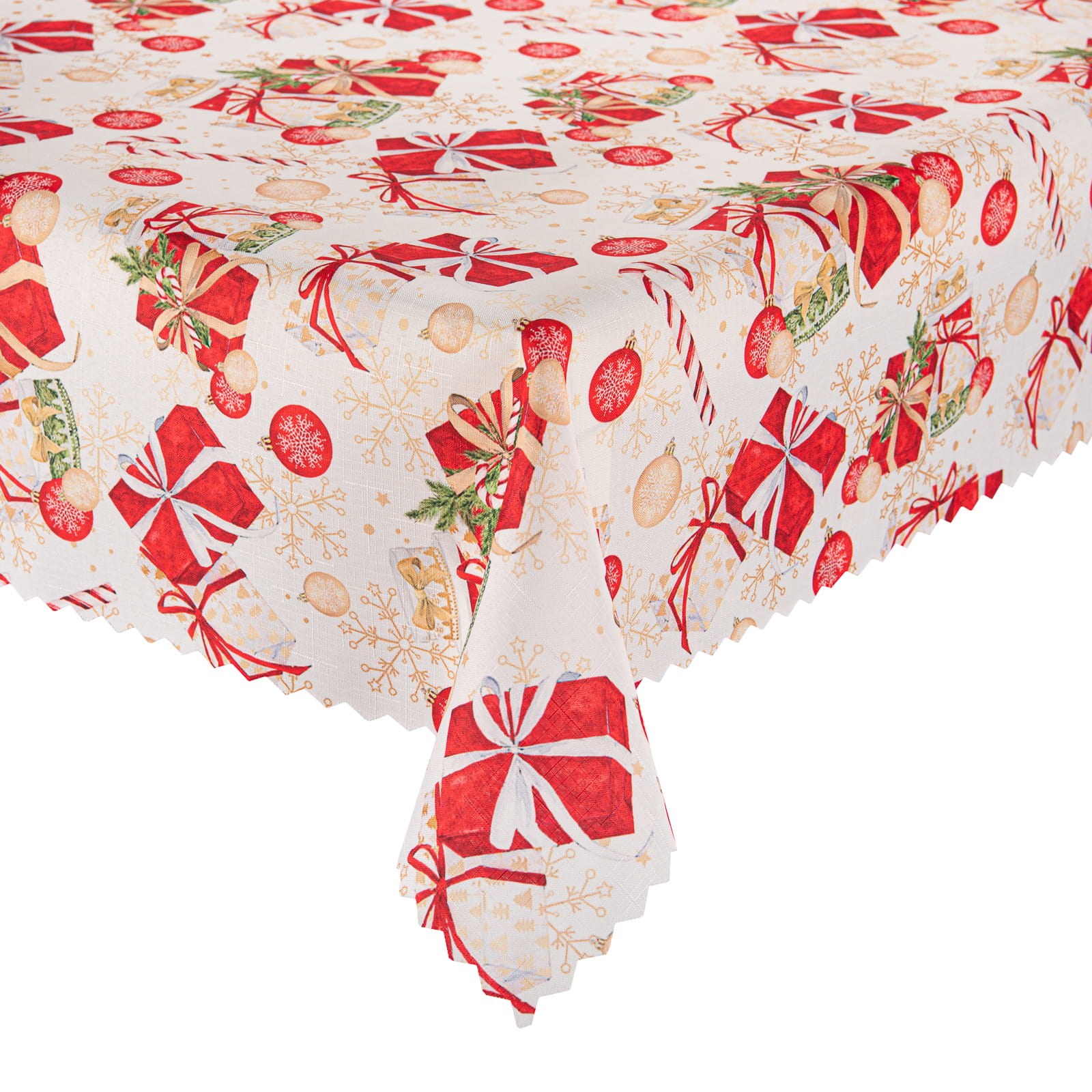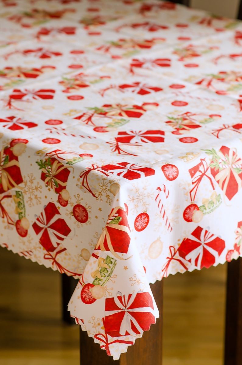 Obrus z prezentami i bombkami na białym tle pozwala łatwo podkreślić wyjątkowy świąteczny klimat rodzinnych spotkań, jednocześnie zapewniając wygodę i ochronę stołu.