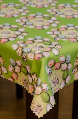 Obrus Wielkanocny plamoodporna jest praktyczny, nowoczesny i cechuje się wyjątkową trwałością.Wykonany z tkaniny poliestrowej, o gramaturze od 140 do 160 g/m2. Tkanina jest obustronnie wzbogacona powłoką plamoodporną (teflon).Tego typu apretura nie pozwala na wchłanianie płynów i brudu we włókna tkaniny, co pozwala uchronić obrus przed uciążliwymi plamami i jest znakomitym rozwiązaniem nie tylko w domu. Obrus plamoodporny nie wymaga tak częstego prania jak tradycyjny.