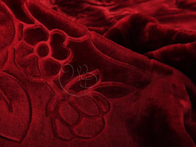 Koc Elway w kolorze bordowym z wzorem tłoczonym. Ozdobna strona koca prezentuje kolor bordowy z tłoczonym wzorem i delikatnym połyskiem a druga strona jest odzwierciedleniem tego samego koloru w nieco jaśniejszej tonacji bez połysku i tłoczonego wzoru.
