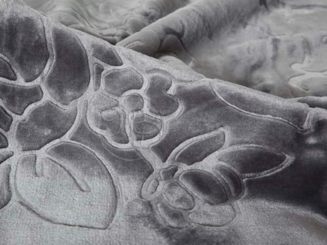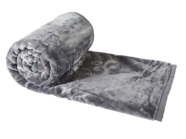 Koc Elway w kolorze grafitowym z wzorem tłoczonym. Ozdobna strona koca prezentuje kolor grafitowy z tłoczonym wzorem i delikatnym połyskiem a druga strona jest odzwierciedleniem tego samego koloru w nieco jaśniejszej tonacji bez połysku i tłoczonego wzoru.
