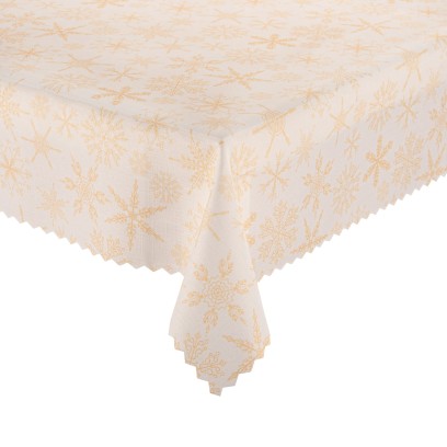 Ten świąteczny obrus prezentuje subtelny, migoczący wzór śnieżynek, nadając stołowi wyrafinowanego blasku i odświętnego charakteru. Minimalistyczny, uniwersalny motyw sprawdzi się zarówno w klasycznych, jak i nowoczesnych wnętrzach. Obrus wykonany jest z wysokogatunkowego poliestru o gramaturze 140–160 g/m² i wyposażony w powłokę plamoodporną, dzięki czemu nawet trudne zabrudzenia można usunąć łatwo i szybko.