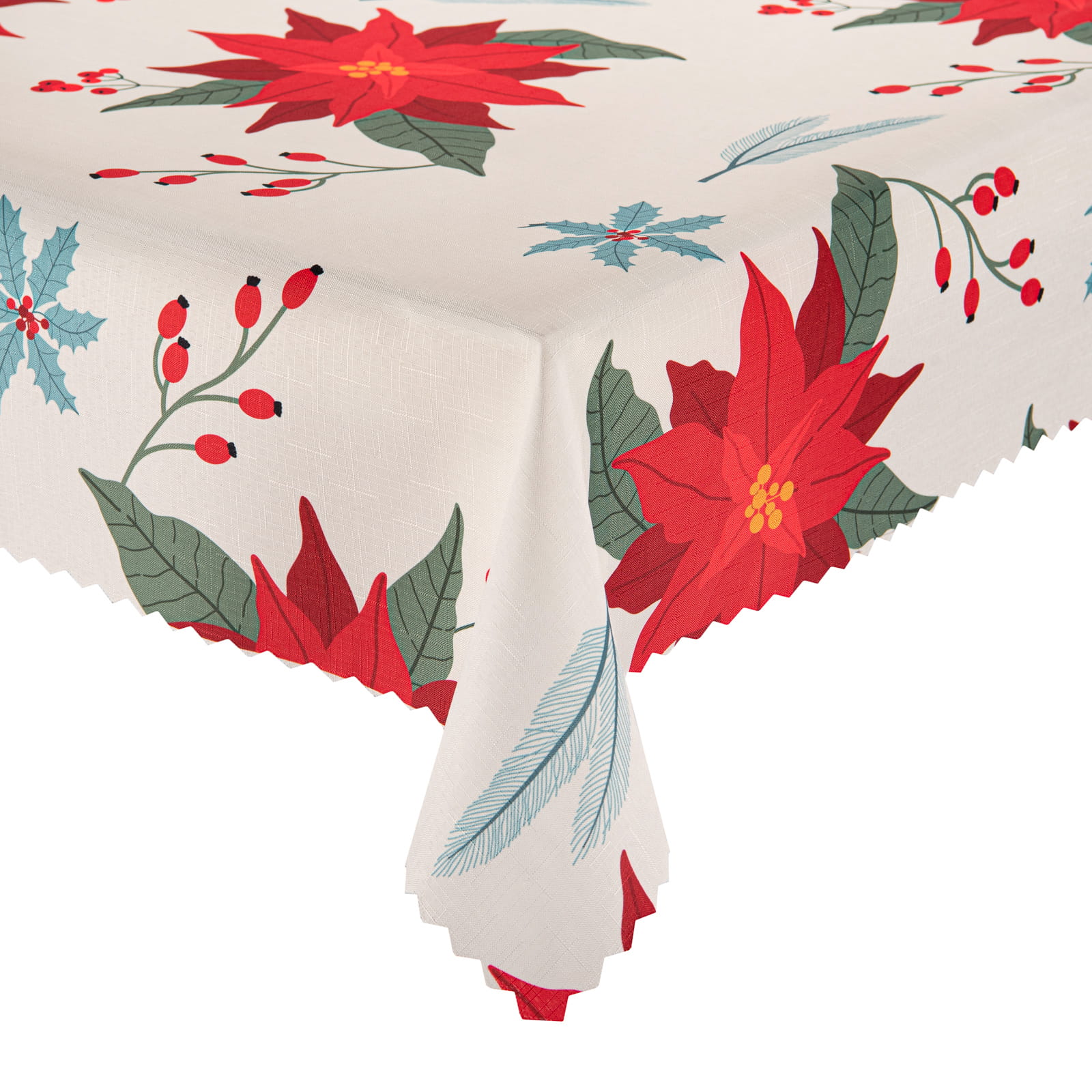 Nowoczesny obrus świąteczny na białym tle wyróżnia się dużymi, czerwonymi kwiatami gwiazdy betlejemskiej, zielonymi liśćmi oraz pastelowoniebieskimi akcentami gałązek i jagód ostrokrzewu. Wyrazisty, wielkoformatowy nadruk ożywia przestrzeń i podkreśla elegancki, świąteczny wystrój zarówno w nowoczesnych, jak i klasycznych wnętrzach. Wykonany z wysokogatunkowego poliestru o gramaturze 140–160 g/m² i zabezpieczony powłoką plamoodporną, obrus jest odporny na plamy i niezwykle łatwy do czyszczenia, nawet w czasie licznych, rodzinnych przyjęć.