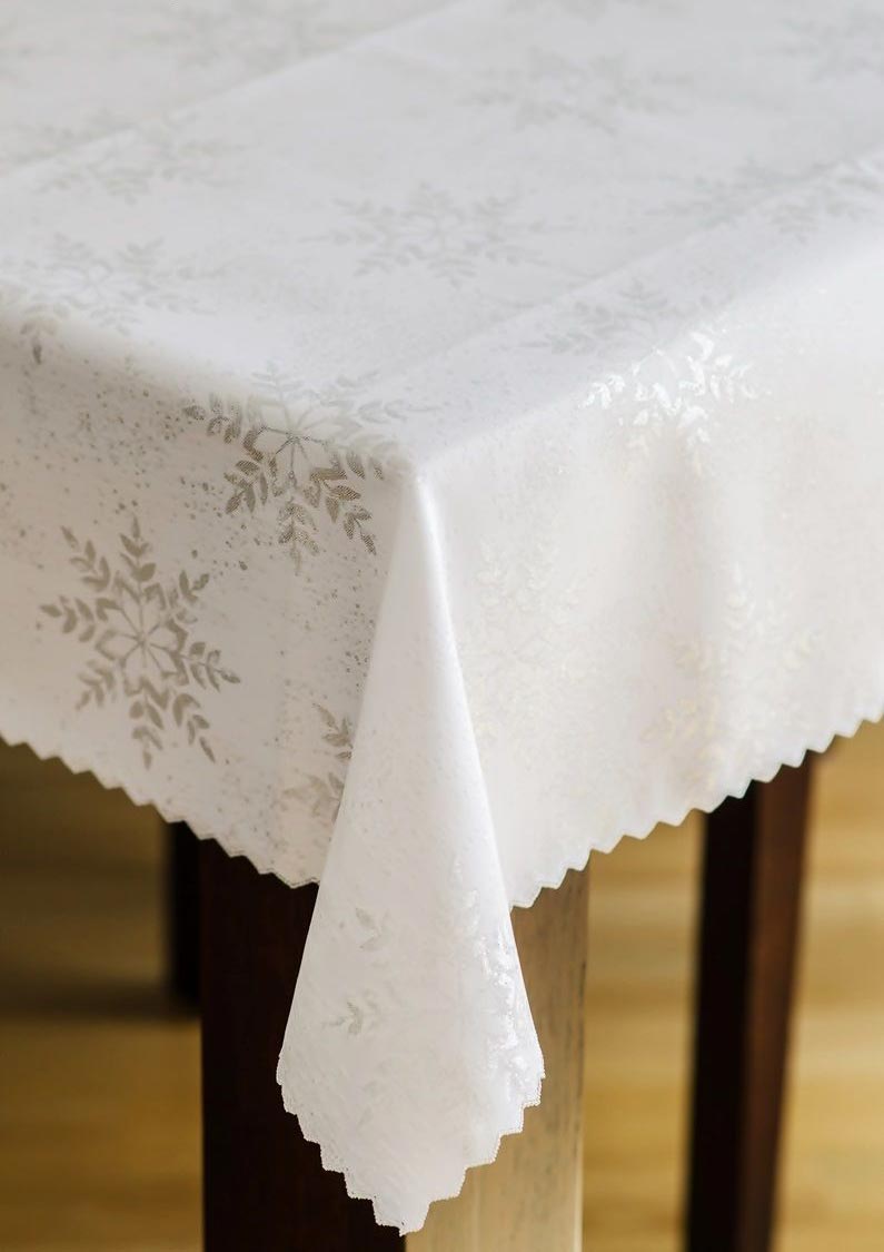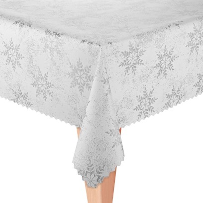 Obrus jest dwustronny z jednej strony jest zdobiony wzorem śnieżki w kolorze srebrnym na białym tle