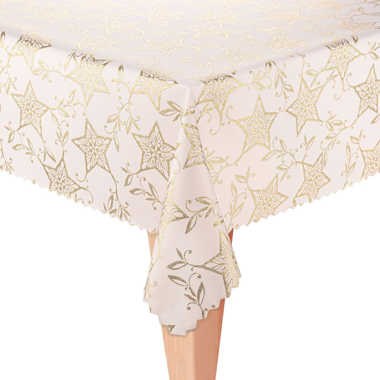 Obrus jest zdobiony dwustronnie wzorem gwiazdy w kolorze złotym na ecru tle