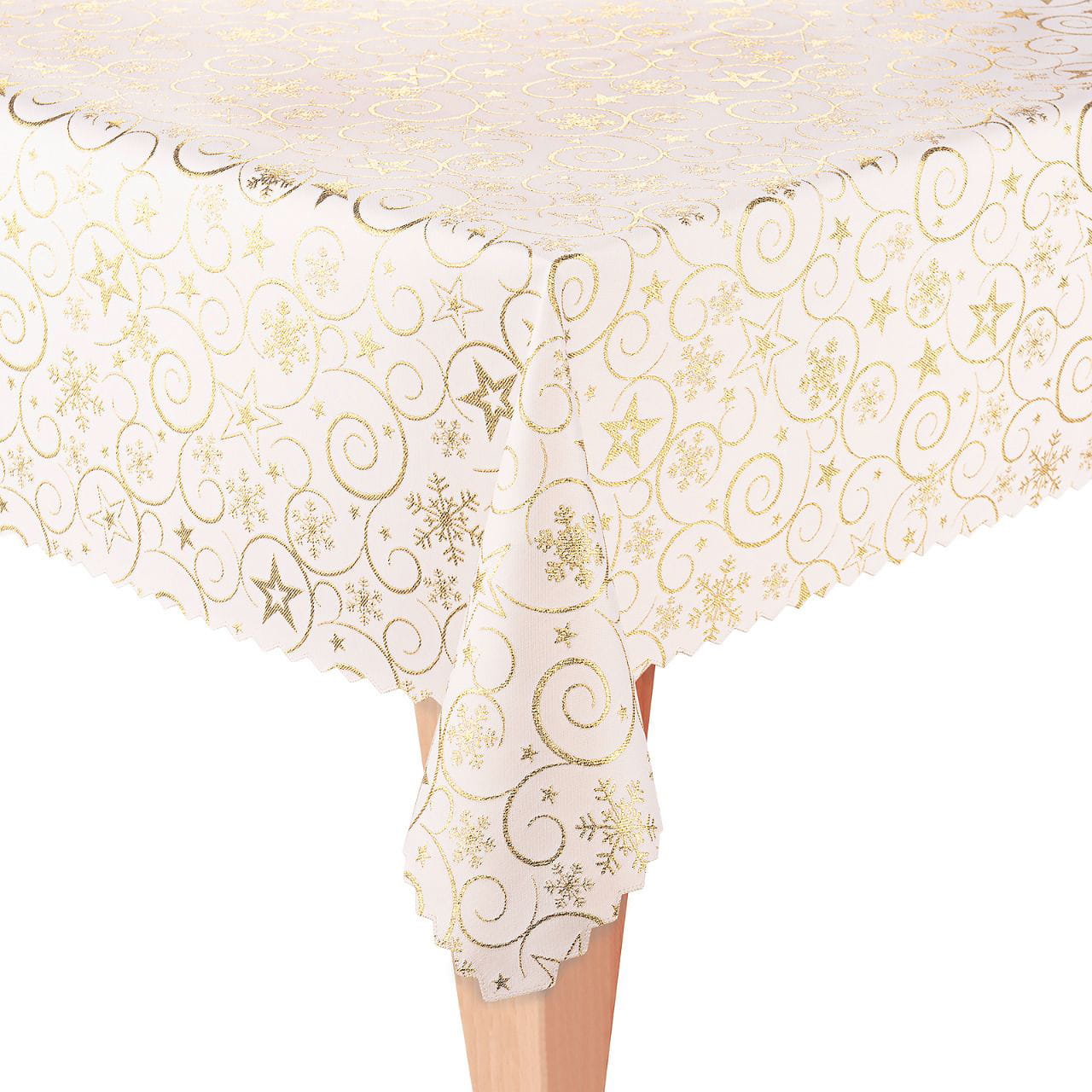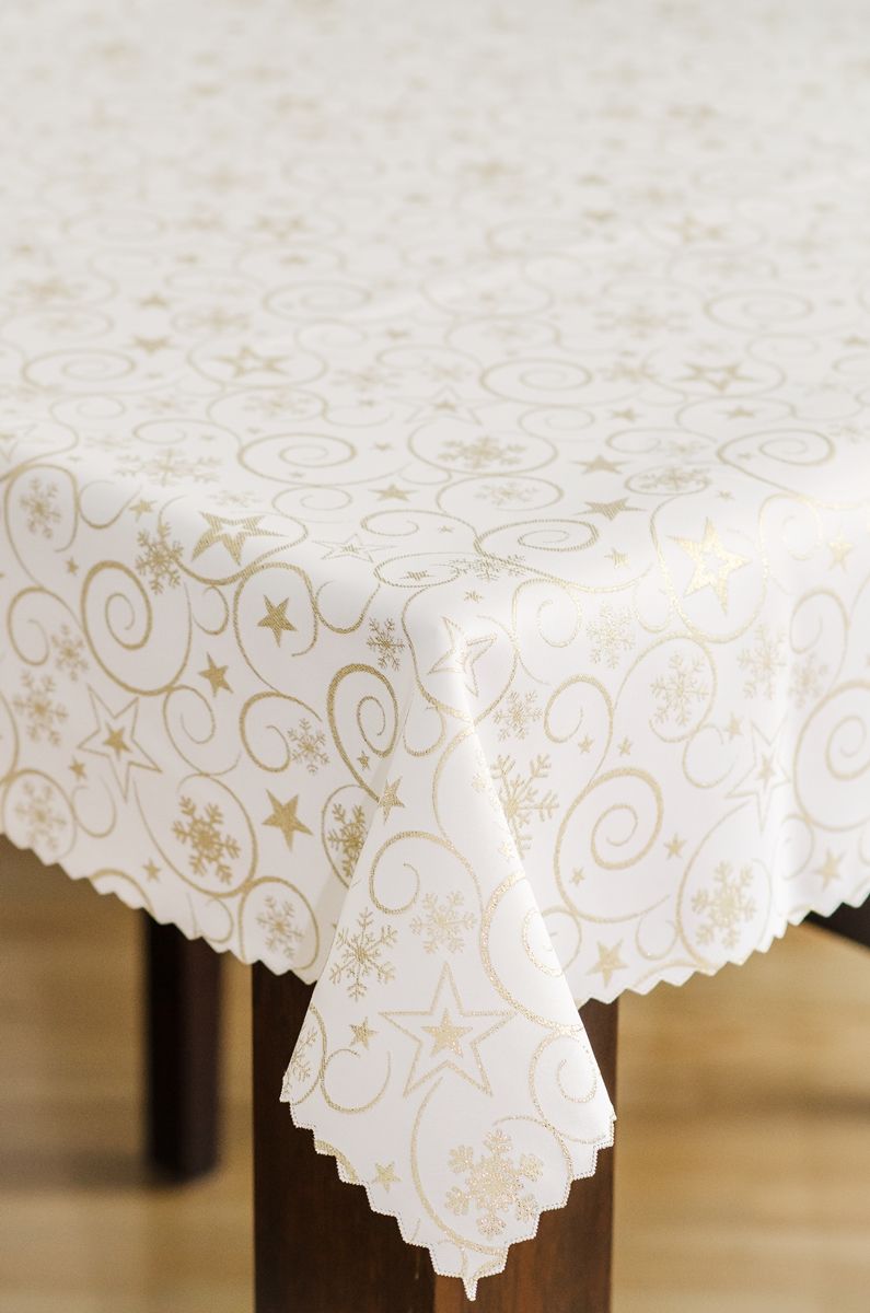 Obrus jest dwustronny z jednej strony jest zdobiony wzorem gwiazdek w kolorze złotym na ecru tle