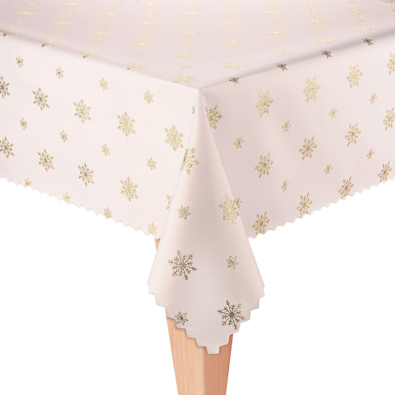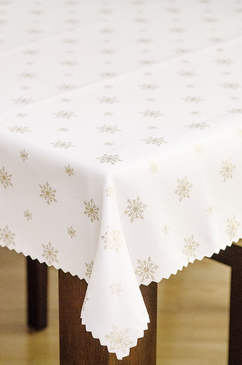 Obrus jest dwustronny z jednej strony jest zdobiony wzorem śnieżki w kolorze złotym na ecru tle
